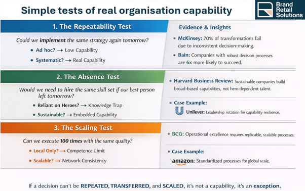 This is where performance divergence begins. What increasingly separates outperformers from underperformers is no longer footprint, channel count, or brand visibility. It is capability: the organisation’s ability to make high-quality decisions, enforce standards, allocate capital, and execute consistently across a structurally complex global network.