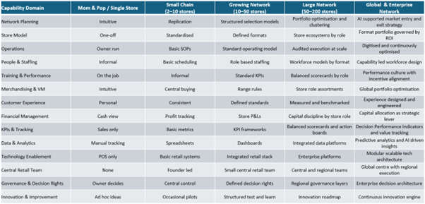 The table above shows how retail capability must evolve as scale increases, shifting from intuition and personal control to structured decision-making, governance, and systems. It illustrates why experience and effort alone do not scale, only efficient capabilities do.